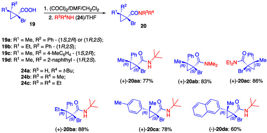 In order to access the densely substituted enantiopure cyclopropanes, we have developed a very facile protocol for the chiral resolution of carboxylic acids 19, utilizing the re-crystallization of racemic acids with cinchona alkaloids [68]. It was shown that a variety of enantiomerically enriched acids 19 with ee > 95% were available in multi-gram scale, in both enantiomeric forms after single crystallization of either cinchonine or cinchonidine salts. Enantiopure acids can easily be converted into amides 20, as a precursor for enantioenriched cyclopropenes (Scheme 3).