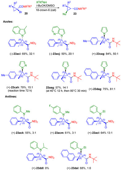 Anilines were also tested in this reaction, and, to our delight, N-methylaniline gave a cyclopropyl amine (+)-23ack in 55% and dr 3:1. p-Flouro-N-methylaniline can be utilized in the described reaction, providing a tetrasubstituted cyclopropane (+)-23acm with similar diastereoselectivity and yield. It was found that increased steric hindrance at the N-termini of the pronucleophile had a significant effect on the reaction course. Thus, aniline bearing an ethyl substituent greatly increased the reaction’s efficacy; the diastereoselectivity increased to 13:1 for (+)-23acl. The utilization of naphtyl-substituted bromocyclopropane precursor gave exclusive formation of (+)-23dal (Scheme 5). Unfortunately, anilines with the secondary alkyl group at the nitrogen atom did not participate in this reaction, most likely due to the excessive steric demands (compound 23ddl in Scheme 5).