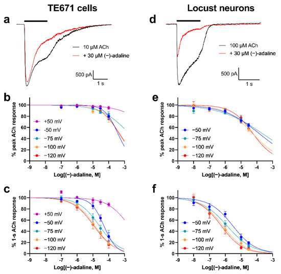 Inhibition by (−)-adaline is voltage-dependent, non-competitive and selective for locust nAChR. (a) Comparison of 1-s current IC50s for (−)-adaline inhibition of nAChRs between TE671 cells and locust neurons at each tested VH. Blue and red bars indicate IC50 and error bars are the 95% CI (left Y-axis). Grey bars show selectivity (right Y-axis) for locust neuronal nAChR over human muscle nAChR; in all cases p < 0.0001 (****). (b) IC50s (with 95% CI) for 1-s data were plotted against VH and fitted with Equation (3). The slopes of the lines (δ) were both significantly greater than 0 (p = 0.0015 and 0.0022) confirming voltage-dependent inhibition by (−)-adaline of both TE671 cell and locust neuronal nAChRs. The δ-values indicate that (−)-adaline can bind deep in the pore beyond the equatorial leucine gate. (c) Concentration-response plots showing the peak (left) and 1-s (right) current response of TE671 cells to ACh alone (black) and to ACh co-applied with 20 µM (−)-adaline (red) at VH = −75 mV. Points are the mean% of the maximum response to ACh alone and error bars are SEM (n = 16). There was a significant (both p < 0.0001) reduction in maximum response to ACh. ACh EC50s are given in Table 3 but did not significantly increase in the presence of (−)-adaline. Furthermore, plotted in grey are the mean% of control ACh response at each ACh concentration (±SEM, n = 16) to evaluate any dependence of inhibition on ACh concentration.