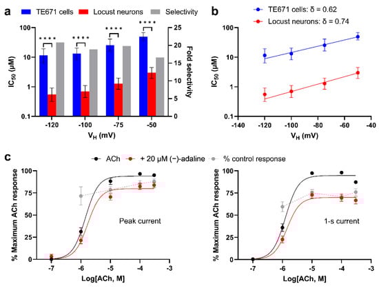 We further analysed the voltage-dependence by applying the Woodhull Equation (3) [33] to predict the depth of binding of (−)-adaline in the nAChR pore. Plots of IC50 (1-s) vs. VH revealed a significantly sloping relationship for inhibition of both TE671 cell and locust neuronal nAChR (p = 0.0015 and p = 0.0022, respectively) (Figure 4b). The slopes of the relationships predicted that the fractional distance of the electric field traversed (δ) when (−)-adaline binds was 0.62 for TE671 cells and 0.74 for locust neurons.