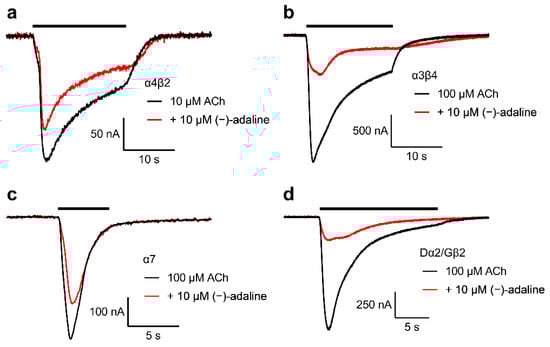 Whole-cell current recordings were obtained from nAChR-expressing oocytes by two-electrode voltage clamp using an Axoclamp 2A voltage clamp amplifier (Molecular Devices, USA). An oocyte was transferred to the perfusion chamber and perfused (~5 mL/min) with standard oocyte saline (SOS) (100 mM NaCl, 2 mM KCl, 1.8 mM CaCl2, 1 mM MgCl2, 5 mM HEPES, pH 7.6). Microelectrodes were pulled from borosilicate glass capillaries (GC150TF-4, Harvard Apparatus, Cambridge, UK) using a programmable micropipette puller (P-97, Sutter Instruments Co., USA), having resistances between 0.5 and 2.5 MΩ when filled with 3 M KCl. The oocyte was voltage-clamped at a holding potential (VH) of −75 mV. ACh was consistently used as the agonist, and it was applied without or together with (−)-adaline via a MPS-2 multi-channel gravity fed perfusion system (World Precision Instruments, UK). Atropine (0.5 μM) was added to the SOS to prevent any endogenous muscarinic ACh receptor response [46]. Output currents were transferred using an NI PCI-6221/BNC-2110 A/D converter (National Instruments, USA) to a PC and WinEDR software (Dr John Dempster, Institute of Pharmacy & Biomedical Sciences, University of Strathclyde, UK) was used for recording and analysis.