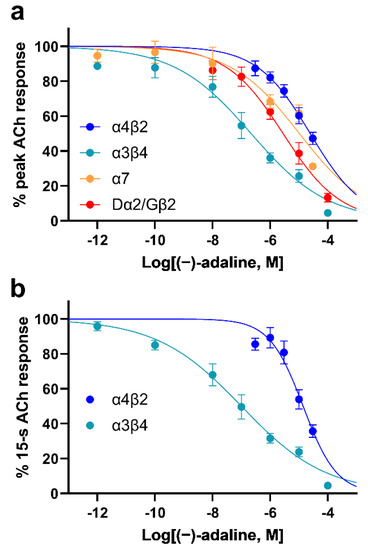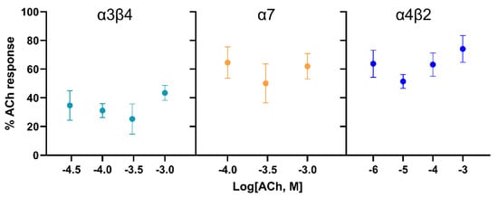 For each of the mammalian nAChR subunit combinations, the inhibition by 10 μM (−)-adaline was determined at several ACh concentrations (according to the sensitivity of each type). There were no significant differences in the level of inhibition across the ACh concentration ranges tested (Figure 7), supporting the previous finding that (−)-adaline is a non-competitive antagonist of nAChRs.