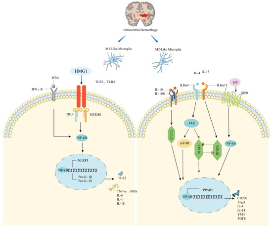 Activation of high-mobility histone 1 (HMG1) and Toll-like receptor (TLR)2 or TLR4 promotes M1-like responses in microglia via the NF-κB pathway. Binding of IFNγ to the receptor promotes microglia polarization to the M1 state. STAT6 accumulates in response to IL-4 and is responsible for transcription of M2-associated genes. IL-13 and IL-4 upregulate the expression of M2 microglia markers, including Arg-1 and YM1, in microglia via the JAK-STAT6 pathway. IL-10 inhibits the production of anti-inflammatory factors. Sphingosine-1-phosphate (S1P) receptor signalling contributes to the downregulation of proinflammatory cytokines and enhances M2-like responses after ICH; MYD88, myeloid differentiation primary response protein MYD88; TRIF, TIR domain-containing adaptor molecule 1; PPARγ, Peroxisome proliferator-activated receptor-γ.