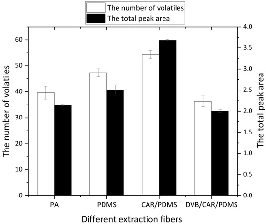 When fixing other conditions but changing different extraction fibers, the detection results are shown in Figure 1. The adsorption capacity of different extraction fiber fibers for Jinhua ham flavor substances varied. The number of compounds and peak areas detected by the composite coating was twice as high as those detected by the single polar coating and the non-polar coating. In comparison, the 75 μm CAR/PDMS extraction tip had better performance on sensitivity, adsorption capacity, and chromatographic response value, so it was chosen as the extraction fiber tip for detecting the flavors of Jinhua ham. In Huang’s study, the CAR/PDMS fiber was selected for the SPME Arrow method for subsequent analysis of furan and its derivatives in commercial food products by GC–MS/MS [21].