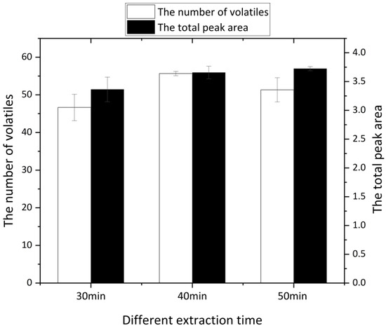 The extraction time also had a large effect on the number of adsorbed flavors. Due to the distinct equilibration time among different samples, the optimal extraction time also varied; the detection results are shown in Figure 2. We compared 30 min, 40 min, and 50 min and found with the increase in extraction time, the total peak area gradually increased, indicating a higher concentration. However, the number of detected volatiles began to decrease after 40 min. Excessive extraction time may destroy ham volatiles. Meanwhile, as the extraction time increased, the extracted fibers tended to saturate, which could affect the effect of extractive adsorption and can even lead to desorption problems. Therefore, 40 min was chosen as the optimal extraction time.