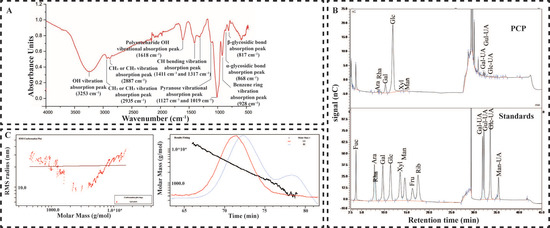 Material basis of PCP. The infrared spectrum of PCP (A). HAPEC ion chromatogram of PCP (B). HPGPC ion chromatogram of PCP (C).