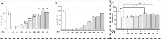The cell viability in microglia. The cells were treated using H2O2 at different concentrations (0, 40, 60, 80, 100, 120, 140, 160, 180, and 200 μmol) for 24 h and 48 h. Then being treated with H2O2 and PCP using different concentrations (0, 40, 60, 80, 100, 120, 150, 200, and 300 μg/mL) was measured with the CCK8 assay. The cell viability of the microglia after H2O2 treatment for 24 h (A), 48 h (B), and the cell viability of microglia after utilizing H2O2 + PCP treatment (C). (ns p > 0.05, * p < 0.05 and ** p < 0.01).