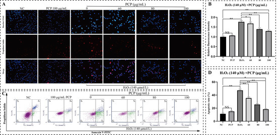 After double staining, most nuclei of normal living cells are uniform light blue and round. Very few dead cells were stained red, and the nuclear structure was normal. Then double staining showed a similar result: the percentage of apoptotic microglia increased significantly after H2O2 treatment. The nuclear of many microglia could be observed as bright blue and irregular in shape. There was also nuclear rupture and shrinkage. The nuclear of most cells shows red fluorescence. In contrast, PCP reduced apoptotic cells (Figure 3A). As observed in microglia, H2O2 treatment effectively enhanced the relative fluorescent intensity (p < 0.05, Figure 3B). However, PCP significantly scavenged intracellular relative fluorescent intensity within the treatment group (p < 0.05, Figure 3B). Treatment with PCP alone had no difference (p > 0.05, Figure 3B).