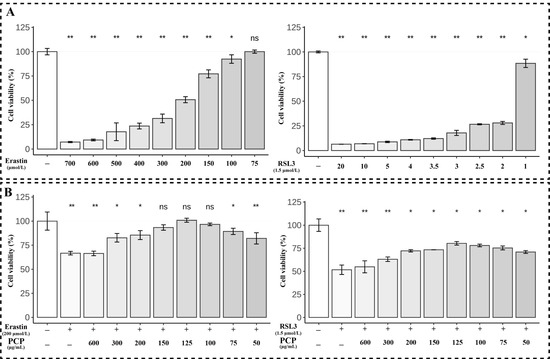The cell viability in the microglia. The cells were treated using different concentrations of ERASTIN (0, 75, 100, 150, 200, 300, 400, 500, 600, and 700 μmol) or RSL3 (0, 1, 2, 2.5, 3, 3.5, 4, 5, 10, and 20 μmol) for 24 h, then treated with ERASTIN (200 μmol)/RSL3 (1.5 μmol) and PCP at different concentrations (0, 40, 60, 80, 100, 120, 150, 200, and 300 μg/mL), determined by the CCK8 assay. The cell viability of microglia after using ERASTIN, the RSL3 treatment (A). The cell viability of microglia after using ERASTIN/RSL3 + PCP treatment (B). (ns p > 0.05, * p < 0.05 and ** p < 0.01).