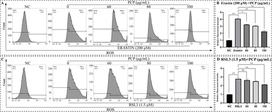 PCP scavenged ERASTIN/RSL3-induced intracellular ROS in the microglia. The cells were treated with ERASTIN (200 μmol) or RSL3 (1.5 μmol) and PCP at different concentrations (0, 60, 80, and 100 μg/mL) for 24 h. We set the NC group treated with DMEM as the control. Then, we stained the cells using a DCFH-DA probe, detected them with a flow cytometer, and established the fluorescence intensity with FlowJo. The ROS level in microglia (A,C). The relative fluorescence intensity of ROS inside microglia (B,D). (ns p > 0.05, * p < 0.05 and ** p < 0.01).
