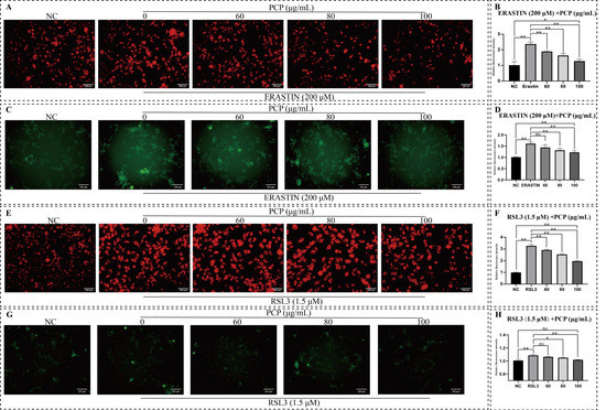 PCP scavenged ERASTIN/RSL3-induced intracellular Fe2+ in the microglia. The cells were treated using ERASTIN (200 μmol) or RSL3 (1.5 μmol) and PCP at different concentrations (0, 60, 80, and 100 μg/mL) for 24 h. The NC group was set as the control and treated with DMEM. Then, we stained the cells with a FerroOrange and Mito-FerroGreen probe and observed them under a fluorescent microscope and validated the fluorescence intensity using ImageJ. Intracellular Fe2+ level in the microglia (A,E); Fe2+ level in nuclear of the microglia (C,G). The relative fluorescence intensity of Fe2+ level in the microglia (B,D,F,H). (ns p > 0.05, * p < 0.05 and ** p < 0.01).