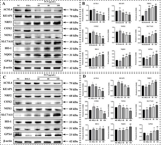 PCP upregulates the ferroptosis pathway in microglia. The cells were treated using ERASTIN (200 μmol) or RSL3 (1.5 μmol) and PCP at different concentrations (0, 60, 80, and 100 μg/mL) for 24 h. The NC group was set up as the control and treated with DMEM. Then, we measured the levels of the KEAP1, NRF2, ACSL4, COX2, NOX1, SLC7A11, HO-1, NQO1, and GPX4 proteins by Western blotting and measured the grey value using ImageJ. The KEAP1, NRF2, ACSL4, COX2, NOX1, SLC7A11, HO-1, NQO1, and GPX4 proteins after ERASTIN/RSL3 intervention (A,C). Statistics of protein’s grey value after β-actin standardization (B,D) (standardized with β-actin). (ns p > 0.05, * p < 0.05, ** p < 0.01, # p < 0.05, and ## p < 0.01).