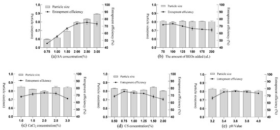 Effect of various factors on microcapsule diameter and EE. (a): Sodium alginate concentration; (b): The amount of BEO added; (c): CaCl2 concentration; (d): Chitosan concentration; (e): pH value.