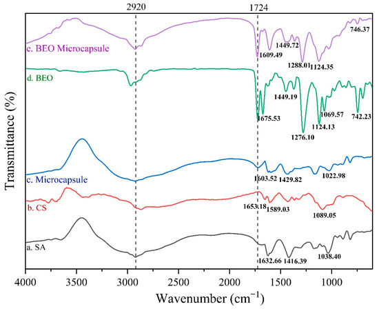 By comparing Figure 3a–c, it could be seen that different absorption bands appear at 1633 cm−1, 1429 cm−1, and 1022 cm−1 in Figure 3c. They correspond to the -COO− and C-OH stretching vibration bands of SA in Figure 3a, as well as the amide I band (1653 cm−1) and vibration of the pyranose structure (1089 cm−1) of CS in Figure 3b, respectively. The original bands at positions 1653 cm−1 and 1089 cm−1 in the CS spectrum were slightly shifted to the right in the microcapsule spectrum. Previous studies have shown that this displacement was caused by the ionic interaction between the positively charged amino groups and the negatively charged groups [17,20]. Additionally, due to the formation of polyelectrolyte between -NH3+ in CS and -COO− on SA, the absorption band at 1022 cm−1 was significantly weakened. The above results could demonstrate that the microcapsule composite membrane formed by the electrostatic interaction between the wall materials was in good condition [21]. Comparing Figure 3c–e, it can be seen that the position of the absorption band in Figure 3e roughly coincides with the absorption band appearing in Figure 3c,d, but the intensity had changed, and no new absorption bands appeared [18]. These results indicated that BEO were contained in the BEO microcapsules, and the microencapsulation treatment had no effect on the chemical structure of BEO.