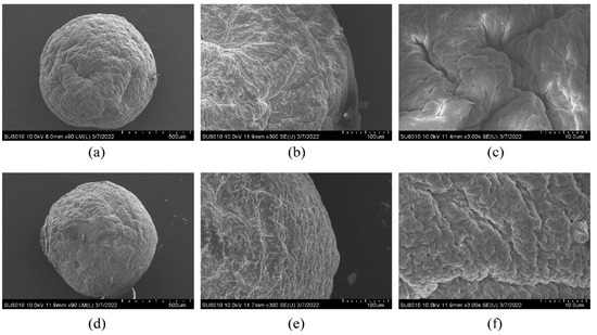 FSEM scanning micrographs of dry microcapsules. (a–c) are the structures of empty microcapsules at magnifications of 90×, 300×, and 3000×, respectively; (d–f) are the structures of BEO microcapsules at magnifications of 90×, 300×, and 3000× under the optimum preparation process.