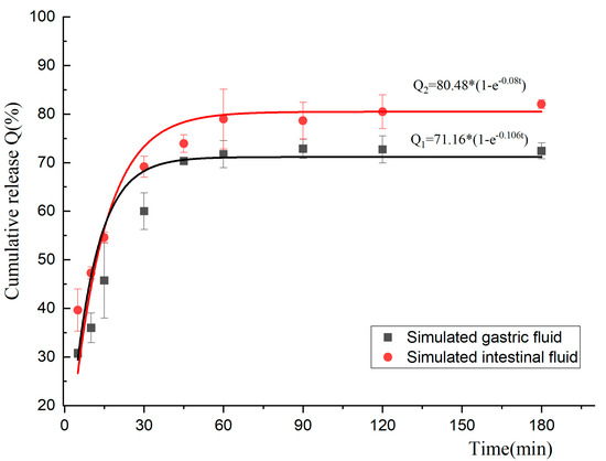 The drug-release mechanism in the microcapsules mainly involved the passive diffusion of the drug itself and the physical degradation and enzymatic degradation of the microcapsules in the simulated environment. Additionally, it was affected by various factors, such as the physicochemical properties of the drug itself, wall materials, and concentration [30]. The BEO microcapsules were released into the gastrointestinal fluids in a first-order release model. In addition, the Q value of the BEO microcapsules in SIF was higher than that of SGF, which might be due to the degradation reaction of the originally tightly bound calcium alginate microcapsules under the action of chymotrypsin in an alkaline environment [31]. This resulted in the weakening of the electrostatic interaction between SA/CS, which ultimately led to a looser microcapsule structure and a better release effect [32]. Furthermore, it had been suggested that bile salts and phosphates in the intestinal fluid could compete for Ca2+ binding on the calcium alginate gel, which would cause the microcapsules to swell and dissolve in the intestinal fluid [33,34]. At about 45 min, the release results of BEO microcapsules in SGF reached a relatively stable state with a Q value of about 70%. At this point, the Q had not yet reached a stable value in SIF. It indicated that the microcapsules would be better released and absorbed in the intestinal tract, which corresponded to the biological characteristics of digestion and absorption.