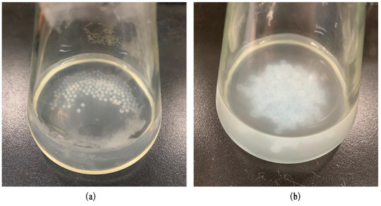 From the R2 analysis of the matching results of the release behaviors of the BEO microcapsules in SGF and SIF in Table 9, it could be seen that the microcapsules in SGF and SIF were mainly released in a first-order release model, and their R2 were 0.98 and 0.95, respectively. The relationship between the Q of the BEO microcapsules and time in the first-order release model is shown in Figure 5, which shows a trend of rapid release at first and then gradual stability. By observing the morphology of the microcapsules at the end point of the simulated gastrointestinal fluid experiment (Figure 6), it was found that the microcapsule particles in SIF were swollen and translucent, and the solution was turbid, while the change in the microcapsule particles in SGF was relatively small, showing dark milky white, and the solution was clearer, which could be concluded that some BEO were not yet fully released. A previous study showed that alginate particles were more easily decomposed in an alkaline environment, which also confirmed the high-release effect of BEO microcapsules in intestinal fluid [23].