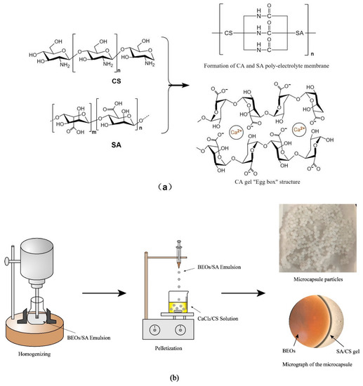 The microcapsules were prepared using the sharp-hole condensation method. The preparation principle is shown in Figure 7a: the large amount of -COO− on the SA molecular chain and -NH3+ on the CS molecular chain formed a polyelectrolyte membrane under the electrostatic action of the charged force, and then BEOs were wrapped in it. Additionally, the free Na+ in the SA solution and the Ca2+ in the coagulation bath solution formed a three-dimensional network gel with an “egg box” structure through ion exchange so that the BEO were uniformly dispersed among the alginates [27,35]. The microcapsules were prepared according to the method of Yostawonkul et al. [31]. The preparation process is shown in Figure 7b; first, the SA solution and CS/CaCl2 solution were prepared by stirring in a 60 °C water bath and left at room temperature overnight. Second, BEO, Tween-20 (70 μL), and glycerol (100 μL) were added to the SA solution (10 mL), stirred at 400 rpm for 10 min to prepare a pre-emulsion, and then the mixed emulsion was homogenized at 10,000 rpm for 10 min. Finally, the mixed emulsion of BEOs/SA was dripped from a syringe with a 9-gauge needle (0.7 mm) into the coagulation bath of CaCl2 and CS, stirred magnetically at 450 rpm, and continued for 30 min. After rinsing with distilled water, excess water and oil were wiped off with filter paper, and the wet BEO microcapsules were obtained by filtration. Further, the dried microcapsule particles were obtained in a blast-drying oven at 40 ℃ overnight.