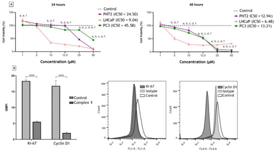 Effects of complex 1 on prostatic cell lines. (A) Cytotoxic activity of complex 1 on non-tumorigenic lineage PNT-2 and the tumor lines LNCaP (hormone-responsive) and PC-3 (androgen-independent) after 24 and 48 h of treatment. a: comparison between PNT-2 and control; b: comparison between LNCaP and control; c: comparison between PC-3 and control; d: comparison between PNT2 and LNCaP; e: comparison between PNT2 and PC-3; f: comparison between LNCaP and PC-3. IC50 is also presented. (B) Expression analysis of Ki-67 and Cyclin D1 on LNCaP cells by flow cytometry (white peak). Secondary antibody alone was used (traced gray peak). **** p < 0.0001. Results were presented as mean ± SD of three independent experiments repeated three times. Control was cells treated with dimethyl sulfoxide (DMSO).