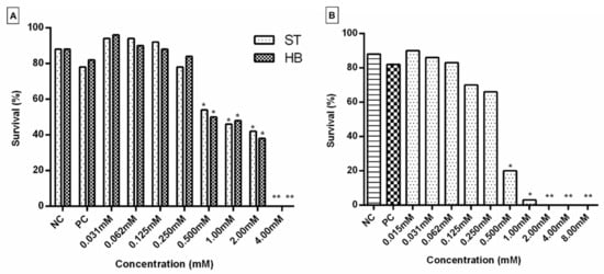 Survival rate of D. melanogaster obtained from the Toxicity Test (TX) of different concentrations of complex 1. (A) Lineages of the Standard (ST) Cross and High-Bioactivation (HB) Cross used in the SMART test; (B) lineages used in the ETT test. * p < 0.05 and ** p < 0.01.
