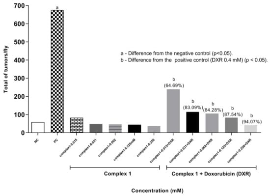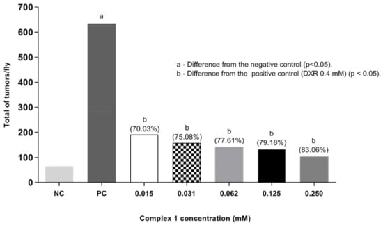 Finally, a post-treatment assay in D. melanogaster was also performed under the same experimental conditions as the co-treatment, though exposing the larvae to DXR first. After six hours, the flies were subjected to complex 1. The results are shown in Figure 5. A significant difference in tumor frequencies was observed at all concentrations tested (0.015, 0.031, 0.062, 0.125 and 0.250 mM) when compared to the positive control (DXR 0.4 mM) according to Mann–Whitney test (p < 0.05). The total frequencies of tumors obtained per fly were: 0.95, 0.79, 0.71, 0.66 and 0.52%, respectively. It is noted that, with the increase in the concentration of the copper complex, there was a reduction in the frequency of tumors, which shows the anticarcinogenic potential of the complex and its effect in reducing damage (reduction in tumors of 70.03, 75.08, 77.61, 79.18 and 83.60%, respectively). In this context, the results obtained suggest an antitumor response of complex 1, which needs to be validated in other animal models.