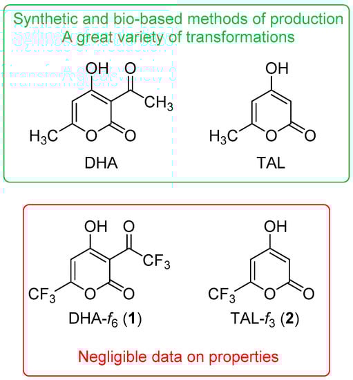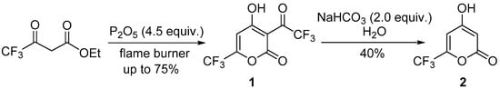 On the other hand, the introduction of fluorine into the structure of molecules often leads to a modification of their chemical properties [13] and is a common strategy in drug design [14,15,16,17,18], pesticides synthesis [19,20], and other areas [21,22,23,24]. However, there are very limited data on fluorine-containing analogs of TAL and DHA in the literature, which practically do not cover their properties. The only synthesis of 4-hydroxy-3-trifluoroacetyl-6-trifluoromethyl-2H-pyran-2-one (hexafluorodehydroacetic acid, DHA-f6, Figure 1) was performed by the heating of trifluoroacetoacetic ester in the presence of P2O5 and proceeds through formation and dimerization of trifluoroacetylketene [25]. Hydrolysis of DHA-f6 in aqueous NaHCO3 leads to 4-hydroxy-6-trifluoromethyl-2H-pyran-2-one (trifluorotriacetic acid lactone, TAL-f3, Figure 1) [25]. The second route for the synthesis of TAL-f3 presented in the literature comprises cyclization of the corresponding trifluorodioxocaproic acid with acetic anhydride [26]. Among the properties of TAL-f3, only modification of the 4-OH group is known, which was methylated with Me2SO4 [27] and triflated with Tf2O [26]. The ring-opening of the O-methyl derivative on treatment with magnesium methylate gave methyl 3-methoxy-5-oxo-6,6,6-trifluoro-5-hexenoate [27] and the 4-OTf derivative reacted with 4-(methylthio)phenylboronic acid to give a Suzuki coupling product [26].
