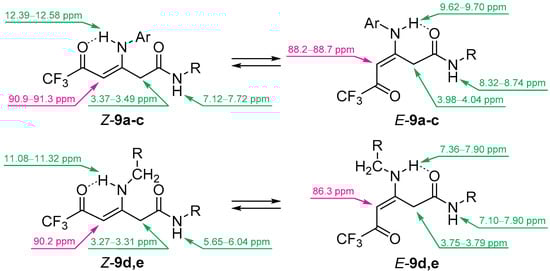 Although Z-form of enaminones is predominant because of an effective intramolecular hydrogen bonding, the contribution of an E-isomer may be affected by the electronic nature of a substituent at a nitrogen atom [36] or by an alternative hydrogen bond formation [37], which is the case for product 9 (Figure 3). The ratio of isomers is solvent-dependent, and Z-form mostly prevails, except for compound 4a in DMSO-d6 (Table 5). The assignment of isomers was conducted on the basis of 1H and 13C NMR spectra (Table S3 in Supplementary Materials). The key signals are low-field NH-protons of Z-9 isomers at 12.39–12.58 ppm (for N-arylenaminones 9a–c in CDCl3) and at 11.08–11.32 ppm (for N-alkylenaminones 9d,e in CDCl3). The corresponding signals for the E-isomers of 9 are under a much higher field in accordance with the literature [37,38]. Among the other features of the NMR spectra of compounds 9 is the existence of methylene protons and amide NH-protons at a lower field and methyne carbons at a higher field for the E-isomer (Figure 3).