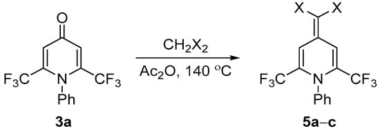 Reactivity of 4-pyridones 3 is greatly affected by strongly acceptor CF3-groups. Thus, electrophilic bromination of 3a with NBS proceeded poorly compared to the non-fluorinated analog [30] and no distinct product was obtained. On the contrary, Knoevenagel condensation did well with malononitrile, barbituric acid, and indane-1,3-dione in acetic anhydride, leading to fluorinated merocyanine dyes 5 (Scheme 4, Table 3). This reveals that the electron deficiency of a heterocycle plays an important role for this reaction, as 1-aryl-2,6-dimethyl-4-pyridones are less active [31,32] compared both to the CF3-substituted pyridone 3a and to the oxygen analog, 2,6-dimethyl-4-pyrone [33]. The time required for the reaction completion is in accordance with the acidity of an active methylene compound, so one can assume that deprotonation is a rate-limiting step, and a high activity of a substrate is necessary to prevent self-condensation of CH2X2.