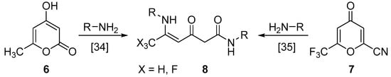 Moving on to the investigation of trifluorotriacetic acid lactone (2) properties, we focused on our previous work on the study of triacetic acid lactone (6) [34] and 2-cyano-6-(trifluoromethyl)-4H-pyran-4-one (7) [35], which gave carbamoylated enaminones 8 (Scheme 5), which proved to be a versatile building blocks for nitrogen heterocycles. In both cases, the substrates were attacked with two equivalents of amine at positions 2 and 6.