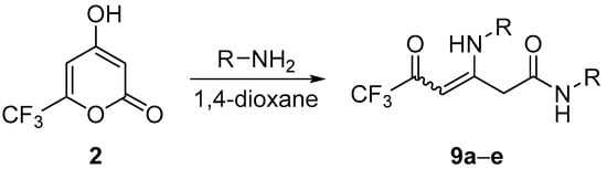 For an explanation of the difference in the regioselectivity of the interaction of TAL and TAL-f3 with amines, we propose the following mechanism. The addition of the first equivalent of RNH2 leads to the formation of dioxoamide C (Scheme 8), which was isolated earlier (X = H) [39]. The intermediate C is then attacked by the second amine molecule at the less hindered atom, C-5, in the case of X = H forming product 8. A preference of the attack at C-3 for the fluorinated derivative may be attributed to a high content of cyclic form D (Scheme 8), analogs of which were described in the literature as the only tautomer in CDCl3 and DMSO-d6 solutions [40,41]. The semiaminal carbon atom is less susceptible to nucleophiles than the free keto group that leads to the selective formation of product 9. It also should be noted that a mixture of regioisomers is usually produced when linear aliphatic CF3-diketones react with aniline [42].
