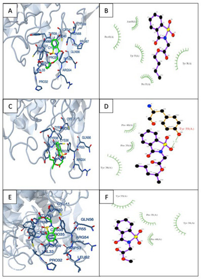 (A,B) Molecular docking studies 3D, and 2D representations for ester 3d. (C,D) 3D, and 2D representations for ester 3g. (E,F) 3D, and 2D representations for ester 3a. Hydrogen bonds highlighted in green with the respective distances between the atoms involved, whereas polar, hydrophobic, and other bonds are represented by an arc with spokes radiating towards the ligand atom.