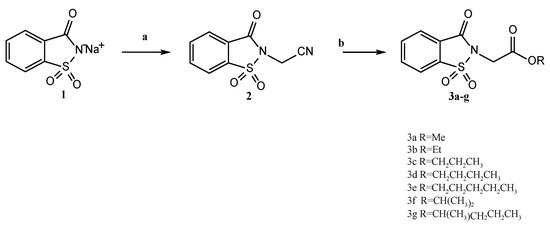 In this work, the 2-(1,1-dioxido-3-oxobenzo[d]isothiazol-2(3H)-yl) acetonitrile 2 (Scheme 1) was synthesized following modified literature conditions by heating the saccharin sodium salt 1 with bromoactanitrile in DMF at 80–90 °C. The reaction was completed with excellent yield (96%) of high purity compared to the previously reported method (66%, 72%, 82%, 88%) [32,37,38]. Whereas, 2-(1,1-dioxido-3-oxobenzo[d]isothiazol-2(3H)-yl) acetate derivatives 3a–g were obtained in moderate to excellent yields following a modified literature procedure [38] by acidic hydrolysis of 2-(1,1-dioxido-3-oxobenzo[d]isothiazol-2(3H)-yl) acetonitrile 2 with concentrated sulfuric acid and excess different alcohols (methanol, ethanol butanol, pentanol, propan-2-ol, pentan-2-ol, respectively) at 100 °C (Scheme 1). Furthermore, esters 3d–g were synthesized by an alternative method of refluxing of 3b in concentrated hydrochloric acid at 120 °C, followed by hydrolysis of 4 with different alcohols in concentrated sulfuric acid at 120 °C (Scheme 2).
