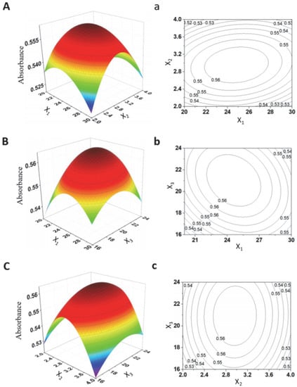 After a single-factor experiment of LRPF determined the preliminary range of synthesis conditions, the synthesis process was statistically optimized by three-level and three-variable Box–Behnken design. The three independent variables selected were the pH (a) of the reaction solution, the mass ratio of trisodium citrate to LRP1 (b), and the reaction temperature (c). The iron content of LRPF was taken as the response variable. In the Supplementary Table S1, these three factors are divided into three levels. The model evaluates the impact of each independent variable on the response. Experimental design and prediction data are analyzed on Design-Expert software to estimate the response of independent variables [28].