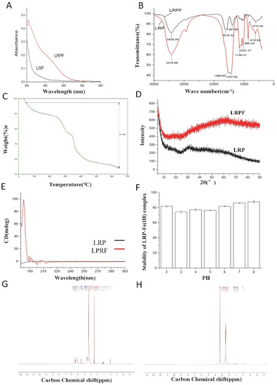 Characterization of LRP and LRPF. (A) Ultraviolet spectroscopy of LRP and LRPF. (B) FT-IR spectrum of LRP and LRPF. (C) Thermogravimetric spectrum of LRPF. (D) X-ray diffraction spectrum of LRP and LRPF. (E) Circular dichroism spectrum of LRP and LRPF. (F) The stability of LRPF in vitro. (G) 1H NMR spectra of LRP. (H) 1H NMR spectra of LRPF.