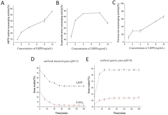 The antioxidant activity of LRPF through metal ion scavenging activity is shown in Figure 3C. The ferrous ion scavenging ability of LRPF was increased with the increased concentration of LRPF, and its maximum scavenging ability was 66.67% at the concentration of 10 mg/mL.