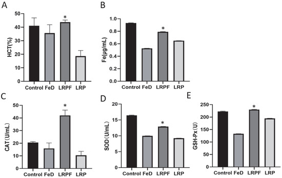 Effects of LRPF on blood parameters and antioxidant indexes in the model mouse of iron deficiency anemia. The level of HCT, Fe, CAT, MDA, SOD and GSH-PH in serum. (A) HCT. (B) Fe. (C) CAT. (D) SOD. (E) GSH-Px. (* p < 0.05).