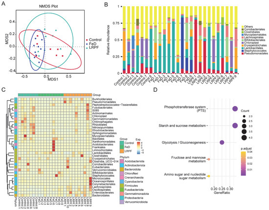Effects of LRPF on the intestinal flora of mice with iron-deficiency anemia. (A) Nonmetric multidimensional scaling (NMDS) plot showing the relationship between samples. The red square means the control group, the blue dot means the iron deficiency (FeD) group, and the green triangle means the LRPF group. (B) The relative abundance of the top 10 microbiotas at the order level. Different colors mean different microbiotas. (C) The heat map showing the top 35 microbiotas at the order level. (D) The dot plot showing the top 5 KEGG signaling pathways of the top microbiotas.