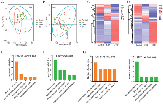 Effects of LRPF on the metabolome of mice with iron deficiency anemia. (A) The dot plot showing the top 2 PCs of positive ion (pos) metabolite. (B) The dot plot showing the top 2 PCs of negative ion (neg) metabolite. (C) The heat map showing the expression trends of the pos metabolites. (D) The heat map showing the expression trends of the neg metabolites. (E) The top 5 KEGG signaling pathways of differentially expressed pos metabolites between FeD vs. the control group. (F) The top 5 KEGG signaling pathways of differentially expressed neg metabolites between FeD vs. the control group. (G) The top 5 KEGG signaling pathways of differentially expressed pos metabolites between LRPF vs. the FeD group. (H) The top 5 KEGG signaling pathways of differentially expressed neg metabolites between LRPF vs. the FeD group.