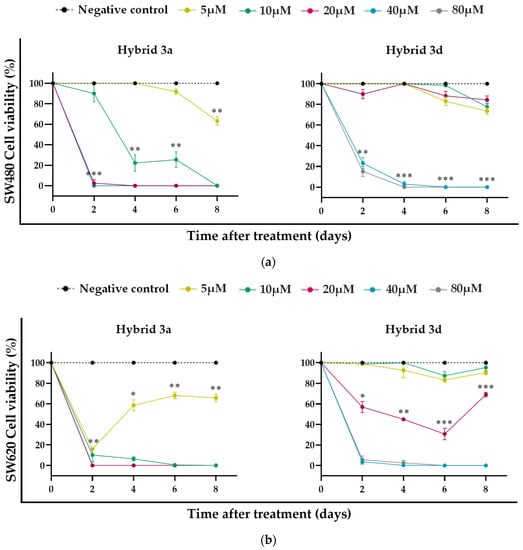 The SW620 cells exhibited greater susceptibility to treatments compared to SW480 cells since the latter required higher concentrations (20 and 40 µM for 3a and 3d) to significantly decrease the cell viability percentage from day 2 post-treatment than did the metastatic cell line (5 and 20 µM for 3a and 3d, respectively) at the same time.