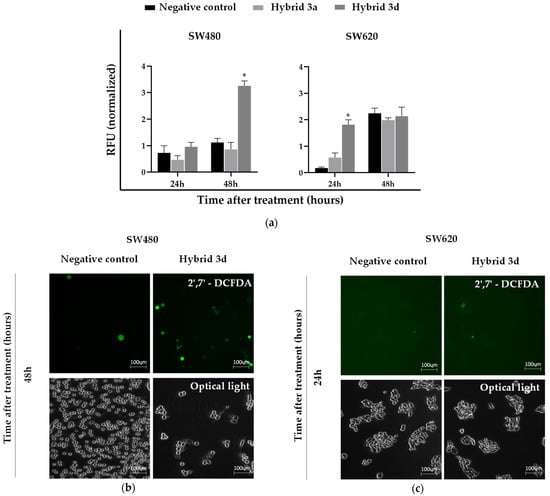 Intracellular ROS production: (a) quantification of ROS in SW480 and SW620 cell lines after 24 and 48 h of treatment with hybrids 3a and 3d; (b) representative images of the SW480 cell line at 48 h post-treatment with hybrid 3d and (c) representative images of the SW620 cell line at 24 h post-treatment with hybrid 3d. Magnification: 20×. Data are presented as the mean ± SE of at least three replicates (* p < 0.05 vs. negative control). RFU: Relative Fluorescence Units.