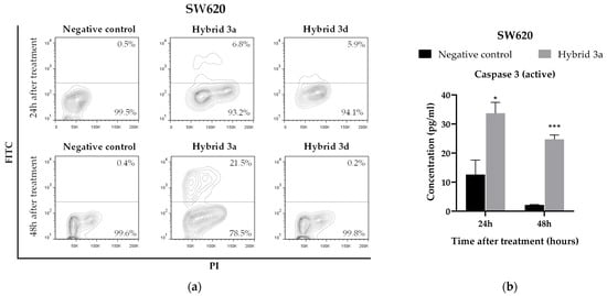 (a) Population of apoptotic cells of SW620 cell line treated with hybrids 3a and 3d for 24 and 48 h. (b) The concentration of markers associated with the apoptosis process in the SW620 cell line at 24 and 48 h after treatment with hybrid 3a. Data are presented as the mean ± SE of at least three replicates (* p < 0.05; *** p < 0.001 vs. negative control). PI: Propidium Iodide.