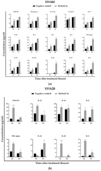 Furthermore, hybrid 3a induced a significant increase in the levels of GM-CSF, IL-13, IL-18, IL-4, TNF alpha, IL-22, and IL-9 at 24 h post-treatment in the SW620 cell line. At 48 h of treatment, the levels of IL-4 and IL-10 were significantly increased by this hybrid in the same cell line (see Figure 5b). The other evaluated cytokines did not show significant differences compared to the control group.