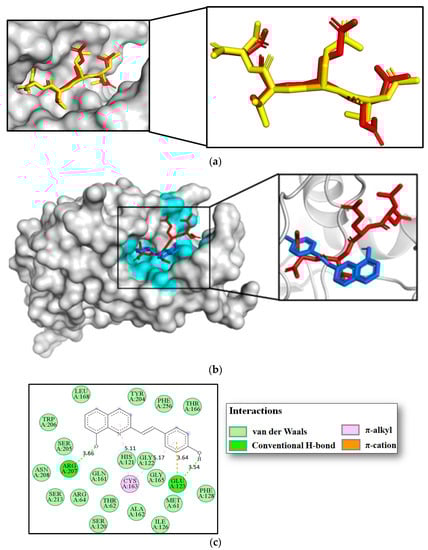 In our docking scheme, we first proceeded with self-docking simulations in order to validate our AutoDock Vina docking protocol. For this purpose, we carried out a comparison of the binding modes of the re-dock Ac-DEVD-CMK inhibitor (in yellow) and their crystallographic binding mode (in red) deposited in the PDB archive (PDB code: 5i9b) []. The results indicated that our docking procedure was able to reproduce the binding mode of the co-crystallized inhibitor Ac-DEVD-CMK (in red) with a strong root mean square deviation (RMSD) of 1.075 Å, showing a close homology (Figure 6a). This finding indicated a high level of feasibility in our protein-ligand docking protocol. After the docking procedure was validated, compound 3a was docked into the caspase-3 catalytic domain. We found that hybrid 3a (in blue) not only efficiently bound to caspase-3 with a closer binding affinity (−7.6 kcal/mol) than the current inhibitor Ac-DEVD-CMK (−8.2 kcal/mol) but it also fits well inside the catalytic cavity of caspase-3, as can be seen in Figure 6b. These facts support our experimental evidence suggesting that compound 3a could prevent cell growth and proliferation in colorectal cancer cells by modulating caspase-3 function. Considering that the active site of caspase-3 comprises eighteen “hotspot” amino acid residues (Arg64, Leu119, Ser120, His121, Gln161, Ala162, Cys163, Ser198, Tyr204, Ser205, Trp206, Asn208, Ser209, Trp214, Ser249, Phe250, Ser251, and Phe252) [], our modeling work also suggested that 3a could bind to caspase-3 through several non-covalent interactions with those critical amino acid residues vital for caspase-3 function (Figure 6c) []. A close view of the 2D ligand-protein interaction plot after the docking procedure showed that 3a interacted with the Arg207 residue via one hydrogen bond at a distance of 3.66 Å. Similarly, the styryl portion was found to create one hydrogen bond and one π–cation contact with the Glu123 residue at distances of 3.54 and 3.64 Å, respectively. We also noted that both the quinoline ring and the styryl moiety were able to bind to the caspase-3 via two π–alkyl contacts with Cys163. Figure 6c also shows numerous hydrophobic contacts that could play important roles in stabilizing the 3a/caspase-3 complex following the binding event. These results suggest that two hydrogen bonding interactions, one π−cation and two π–alkyl contacts with those critical “hotspot” residues, could have important roles in the effective modulation of caspase-3 in 3a-induced cytotoxicity.