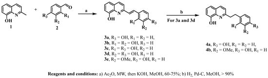 Styrylquinolines 3a–e were obtained via microwave-assisted, Perkin-type condensation between 8-hydroxyquinaldine (1) and benzaldehydes with different substituents (2) []. The reaction yields ranged between 60 and 75%. These compounds have already been reported [,,,,]. However, our synthetic strategy involves microwave-assisted reactions that allow us to create compounds with shorter reaction times than those created using conventional heating methods. Here, the products were obtained in good-to-excellent yields and without appreciable by-product formation. Then, compounds 3a and 3d were reduced using catalytic hydrogenation and yielded 4a and 4b, respectively, at yields greater than 90% [] (Scheme 1).