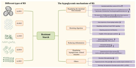 Different types of, and the potential hypoglycemic mechanisms of RS. (a) RS1, the most common RS found in all grains, is a kind of physically inaccessible starch.; (b) RS2, in raw potato or high-amylose maize, has a B- or C-type polymorph; (c) RS3, in cooked and cooled potatoes, a kind of retrograded starch; (d) RS4, chemically modified starch, through the addition of cross-linkages or chemical derivatives; (e) RS5, in processing or cooking oil, a lipid-modified starch. Adapted from Wong et al. [10].