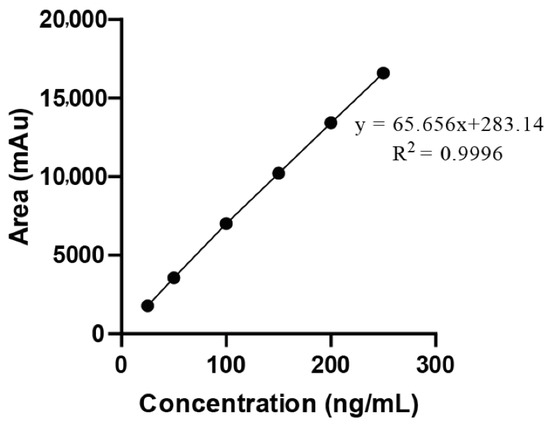 | Interday Precision (Repeatability) (Mean Area ± SD) (n = 6) | %RSD | Interanalyst (Mean Area ± SD) (n = 6) | %RSD | Intraday Precision (Mean Area ± SD) (n = 6) | %RSD | ||||||