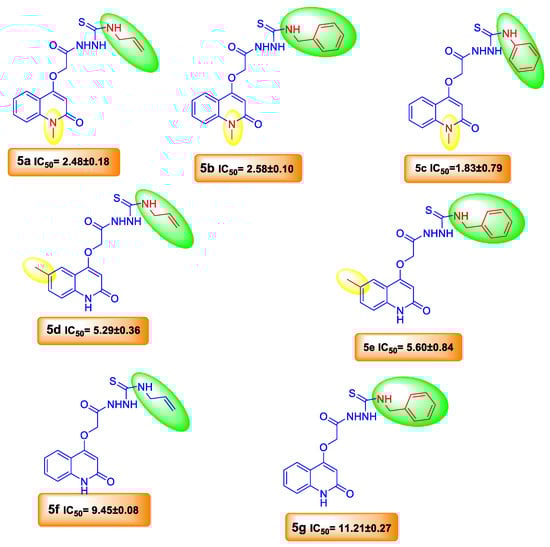 Two series of quinolone derivatives containing thiosemicarbazone and thiazole functionalities 5a–g and 7a–l were synthesized and then screened for their in vitro urease inhibition properties using thiourea and acetohydroxamic acid as standard inhibitors []. The inhibition values of the synthesized compounds 5a–g and 7a–l exhibited moderate to good inhibitory effects when compared to clinically used enzyme inhibitors, thiourea and acetohydroxamic acid (Table 2 and Figure 3). It is worth mentioning that quinolone-thiosemicarbazone hybrids 5a–g are effective molecules for urease inhibition ranking (IC50 = 1.83–11.21 µM) (Table 2 and Figure 3). Among the 5a–g series, compounds 5a–c, bearing a methyl group at position-1 on the quinolone skeleton, are the most active for urease inhibition (IC50 = 1.83–2.48 μM) when compared with the standard inhibitors thiourea and acetohydroxamic acid, which have IC50 values of 22.8 ± 1.31 and 21.03 ± 0.94 μM, respectively. Next, compounds 5d and 5e with p-methylquinolone moiety achieving IC50 = 5.29 ± 0.36 and 5.60 ± 0.84 μM were found to have superior activity compared to the standard inhibitors, thiourea and acetohydroxamic acid.