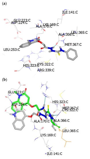 The compounds’ interaction and their binding mode and pose are illustrated in Table 3. By analyzing the compound pose, the methylation of NH of quinolinyl moiety was very important because it hindered the quinolonyl part from forming HB with the amino acid clefts. Compound 5c (N-phenylthiourea derivative) was the only compound whose thiourea functionality formed two HBs with the receptor in a chelation fashion (Figure 4a). To discover the great difference in activity between compounds 5a and 5d, overlay docking between these two ligands inside the receptor was performed. From Figure 4b, the quinolone ring in compound 5f formed extra HB with Asp: 224A and one HB with Ala: 366A. Comparing compound 5c with compound 5b (benzylthiourea), it is clear that both compounds adopted different poses and modes with the receptor. However, compounds 5a and 5b illustrated similar poses (Figure 4c). These results indicate the electronic and geometric effect of the N-substituted thiourea part.