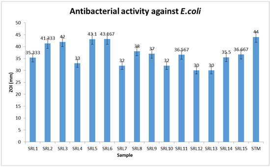 Anti-bacterial activity has attracted substantial attention from researchers in the last few decades due to the harmful effects of bacteria [29]. The present study shows the minimum inhibitory concentration (MIC) values for the anti-microbial (anti-bacterial and anti-fungal) activity of tested compounds, which were also found to have good to moderate inhibitory profiles. Most of the scaffolds in the tested series were found to have higher inhibitory profiles in the presence of streptomycin (44% inhibition), a standard drug. The inhibitory profile of scaffolds depends on the nature and number of substituents which increase or decrease the biological potential of molecules. In addition, a few of them were found to have comparable activity with standard drugs, but in this regard, excellent activity was shown by analogs 5 and 6. These two scaffolds reveal that the functional group located on the para and ortho-position of the aromatic ring is the critical factor for the observations of antibacterial activity. Finally, it is crucial to note that the analogs showed outstanding antibacterial selectivity against E. coli, depending on the substituents. The nature of substituents attached to aromatic rings are responsible for better or poor interaction; therefore, analogs 5 with flouro and nitro moieties and analog 6 containing a tri-flouro group were regarded as the most potent analogs in the tested series. Analog 6 showed somewhat higher inhibition (43.16%) as compared to analog 5 (43.1%);this might have been due to the presence of the tri-flouro group at the para-position which produced strong inhibition against E.coli, as shown in Figure 2.