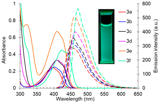 UV-vis absorption (5 × 10−5 M, solid lines) and emission (5 × 10−5 M, dashed lines) spectra of compound 3 in toluene. A photo of solution 3f in toluene was taken under 365 nm of irradiation.